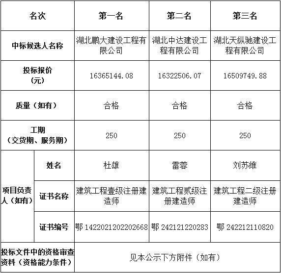 金投?彩虹灣一期(S1號樓綜合商業(yè))及配套工程于2022年12月19日在湖北省電子招投標交易平臺發(fā)布招標公告,2023年01月31日在松滋市開標室(1)開標,并于2023年01月31日完成評標工作。根據(jù)評標委員會提交的評標報告,湖北松滋金投置業(yè)有限公司已經(jīng)確認評標結果,現(xiàn)進行評標結果公示。