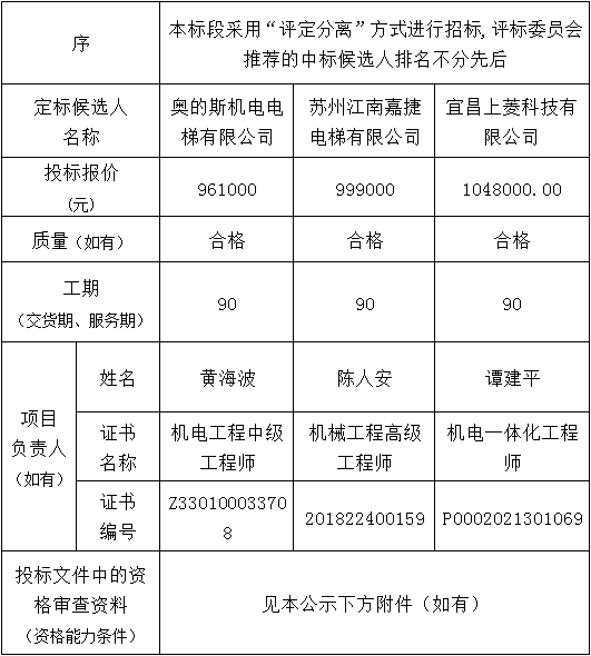 金投?彩虹灣一期(S1號樓綜合商業(yè))及配套工程金投?彩虹灣(一期S1#樓綜合商業(yè))電梯采購及安裝項目于2023年11月14日在湖北省電子招投標交易平臺發(fā)布招標公告,2023年12月11日在松滋市開標室(2)開標,并于2023年12月11日完成評標工作。根據(jù)評標委員會提交的評標報告,湖北松滋金投置業(yè)有限公司已經(jīng)確認評標結(jié)果,現(xiàn)進行評標結(jié)果公示。
