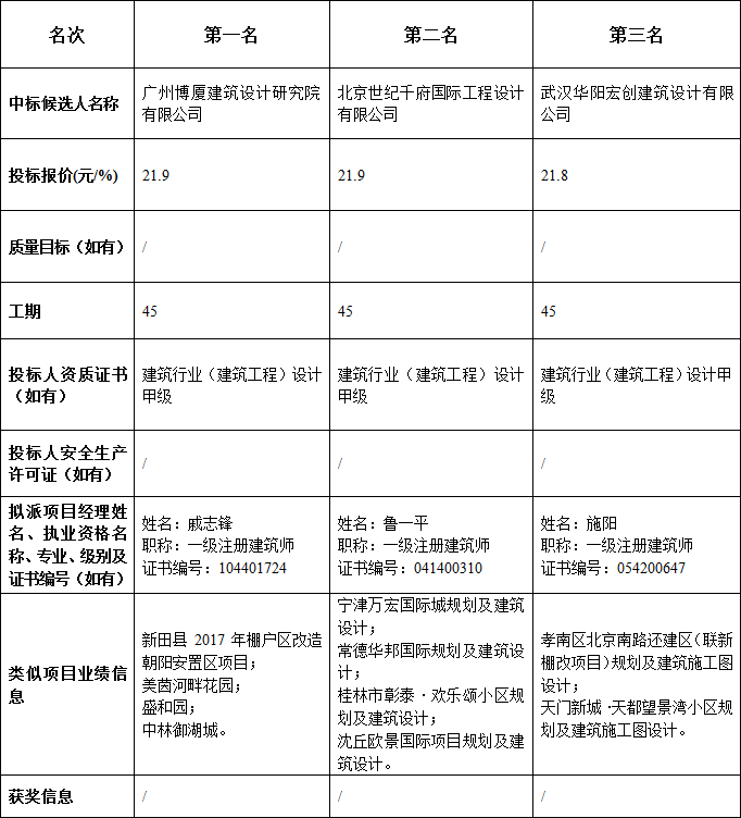 松滋市金投•劃子嘴幸福家園安置小區(qū)及配套設施建設項目設計于2018年11月24日在湖北公共資源交易信息網(wǎng)發(fā)布招標公告,2018年12月24日在松滋市公共資源交易中心開標。根據(jù)評標委員會提交的報告,松滋市金投•劃子嘴幸福家園安置小區(qū)及配套設施建設項目設計已經(jīng)確認開標結果,現(xiàn)進行中標候選人公示。