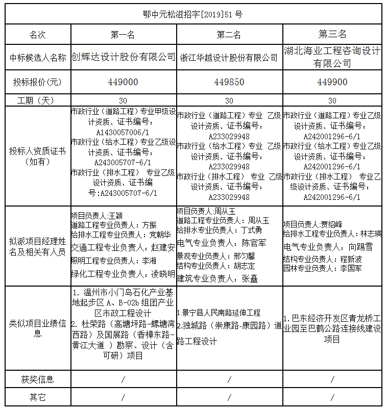 松滋市智能針紡服裝產(chǎn)業(yè)園雙裕路(西望路-白云邊大道)道路工程設計項目于2019年12月25日發(fā)出招標邀請書,2020年1月3日在中元工程咨詢有限責任公司會議室開標,并于2020年1月3日完成評標工作。根據(jù)評標委員會提交的評標報告,松滋金松工業(yè)投資開發(fā)有限公司已經(jīng)確認評標結果,現(xiàn)進行評標結果公示。